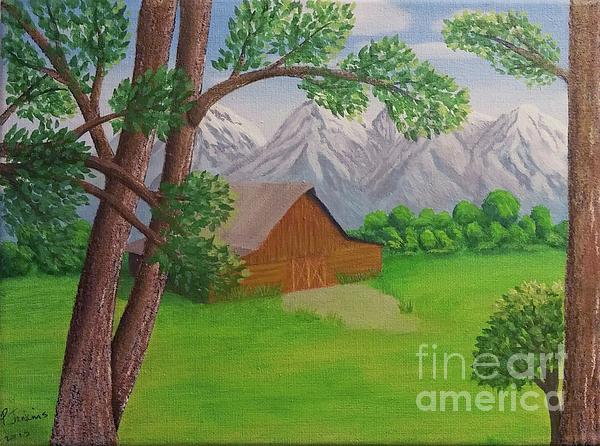 A relaxing scene of an old barn as you exit the woods with the Rocky Montains in the background.